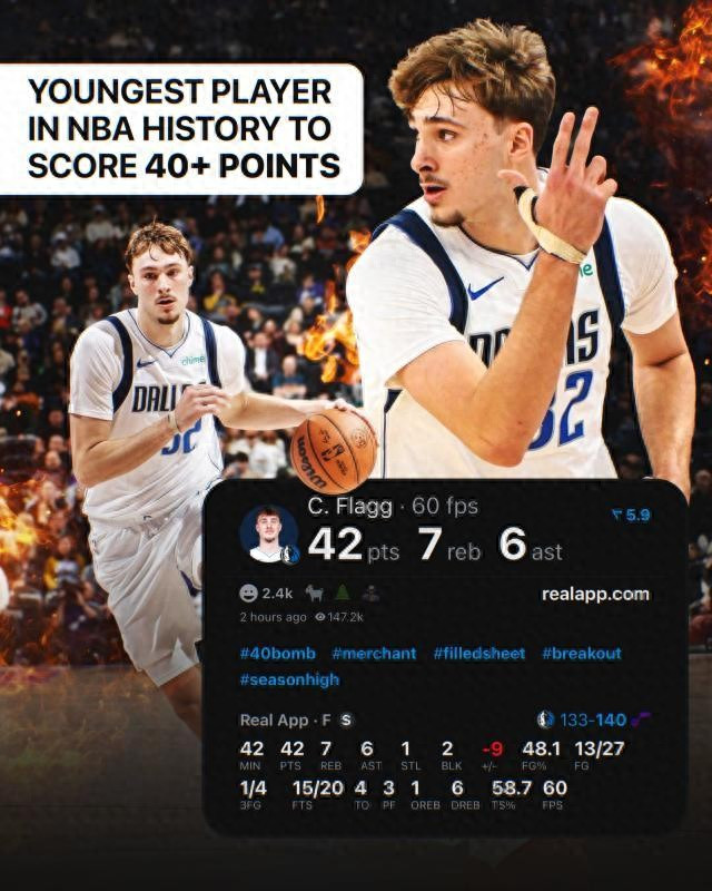 北京时间12月16日,独行侠加时133比140不敌爵士,但球队新科状元秀库珀·弗拉格迎来了生涯之夜。此役他出战42分钟广瑞网,27投13中,罚球20罚15中,狂砍42分7篮板6助攻2盖帽1抢断,成为NBA历史最年轻的40+先生。